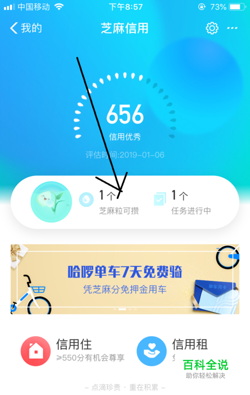 打开芝麻信用界面中看到当前的信用分数,在这直接点击芝麻粒可赞按钮。