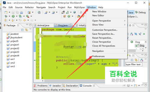 打开MyEclipse软件,点击菜单栏中的window选项,然后选择preferences