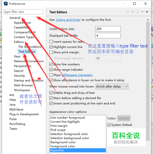 依次展开“General”——“editors”——“text editors”; 或者直接在最上方的搜索框输入 Text Editors,回车