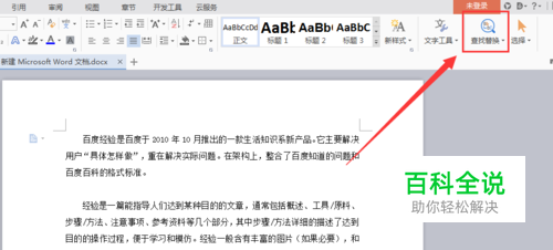 在word的右上方二级标题栏处,你会看到“查找替换”按钮,左键单击。