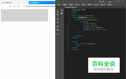 新建一个html网页,在body中插入【<div class="content"></div>】并引入CSS【.content{width: 420px;height: 100px;background: #d4d4d4;padding: 5px 0 5px 5px;}】。