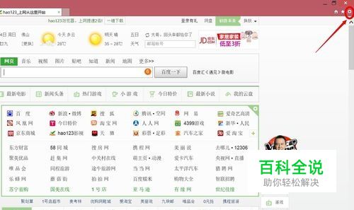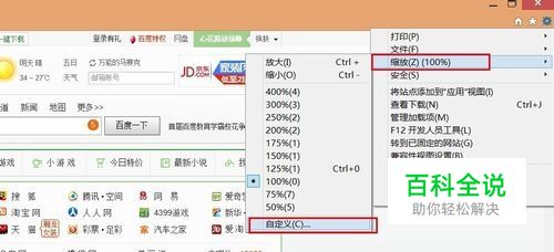 打开Win8.1自带的IE浏览器,随便打开一个网页,(这里打开ww.hao123.com 主页),发现一些网页字体模糊(废话),点击IE右上角小齿轮-->缩放-->自定义,调整缩放大小直到发现网页字体大小清晰即可,并记住缩放倍数(通常为120%-124%笔者这里设置为124%)