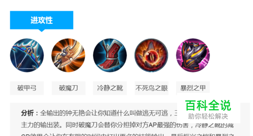 顺风局出装 分析:全输出的钟无艳会让你知道什么叫做逃无可逃,三圣之力和破甲弓是最主力的输出装。同时破魔刀会替你分担掉对方AP最强的伤害,冷静之靴的减CD效果会让你在有限的时间内打出更多的技能输出。最后振兴之恺和暴烈之甲,会把你的硬度提升一个等级!当敌人面对你这样的一个又肉输出又高的英雄,估计应该是想挂机了。