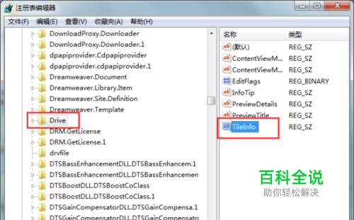 展开至HKEY_CLASSES_ROOT\Drive,在右侧找到并双击打开Tileinfo;