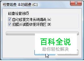 第3步:在弹出的“检查磁盘”对话框中勾选“自动修复文件系统错误”和“扫描并试图恢复坏扇区”复选框,然后单击“开始”按钮。