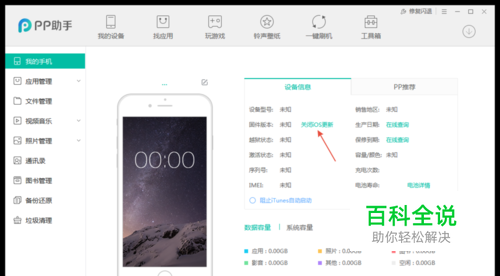 可以看到设备信息的固件旁边有【关闭IOS更新】,或者是到工具箱『系统工具』也可以找得到【关闭IOS更新】。