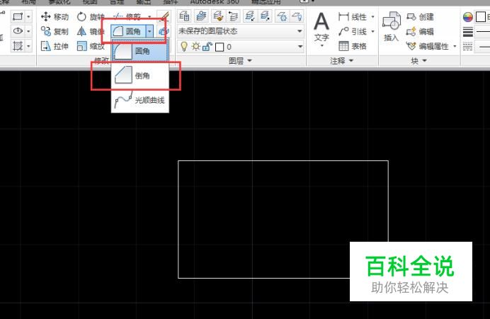 点击上方的“圆角”菜单的下拉按钮,选择“倒角”按钮。