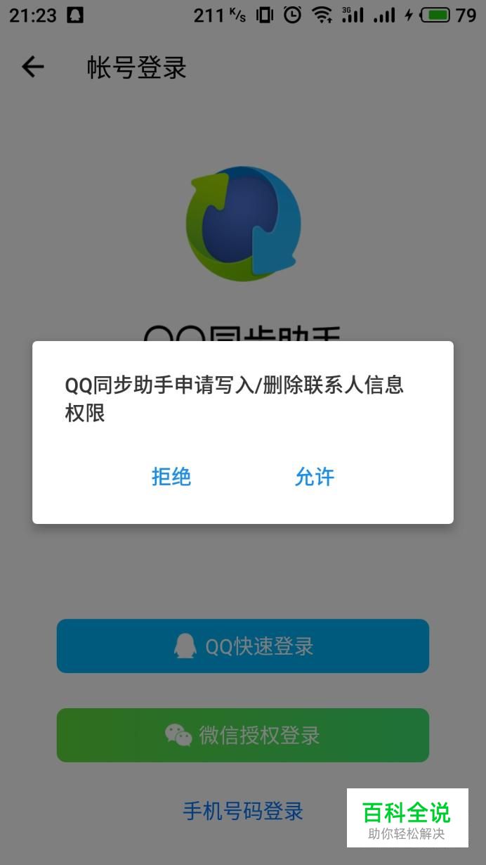 进入QQ同步助手界面,应用会提示获取联系人信息权限,点击“允许”,然后登录账号。