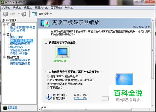 如果问题还未解决》》》》再回到“NVIDIA控制面板”》》》》点击NVIDIA缩放功能》》》》应用确认