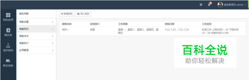 考勤规则 可自定义考勤规则以及导入规则。 ⑴.新增规则:可自定义考勤规则名称、考勤规则适用的部门、工作周期、不同工时制度的工作时长及休息时间。 ⑵.导入规则:可为每一个员工量身订做考勤规则,设定不同的工作周期,以及针对不同的工时制度设定工作时长。