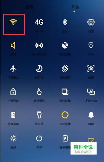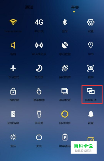 手机下滑,出现快捷菜单,选择开关,点击多屏互动,如下图;
