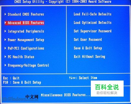 第2步,打开BIOS设置主界面,选中“Advanced BIOS Features(高级BIOS功能设置)”选项,并按回车键,如图2010040512所示。 图2010040512 选中“Advanced BIOS Features”选项