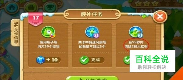 保卫萝卜2第17关攻略,保卫萝卜2森林主题17关怎么过。 首先想要获得水晶、金萝卜一定要完成关卡的额外任务,完成任务不仅可以获得水晶金萝卜的成就还可以获得宝石,宝石可以在商店里购买一些技能。 保卫萝卜2森林17关额外任务: 1. 使用瓶子炮塔消灭30个怪物。 2. 关卡中减速风扇塔的数量不超过3个。 3. 在99秒内清除2颗大松树。 总体来说本关比较简单,主要是清塔时间需要掌握就可以完美通关了。 带有限制时间的我们要着重注意。 首先我们先建立一个减速风扇塔。 然后我们建立第二个减速风扇塔。 消除风扇塔旁边的道具方便建立别的塔。 清除掉第一个大松树。 松树清除之后出来的太阳花塔清除第二个松树。 清除风车增加经济。 清除掉第二个风车增加经济。 继续清除大松树。 最后一个松树清除。 在下面建立一个便便塔方便我们的减速。 下面建立一个便便塔方便我们的拦截。 总结:保卫萝卜2第17关攻略,保卫萝卜2森林主题17关比较简单很容易通关。