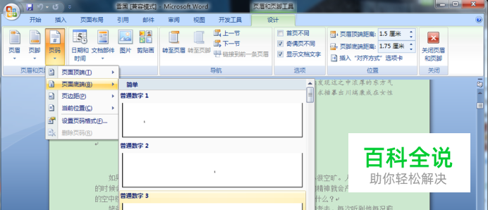 第六步,再次选择“页码”中的“页面底端”,这次将“页面底端”选择为“普通数字1”,如图:
