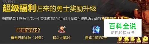 最近游戏堡小编在玩dnf的时候,有童鞋来问游戏堡小编dnff归来的勇士礼包怎么得,里面有什么,相信有许多想要回归dnf的童鞋也想知道吧。 今天游戏堡小编就在这里跟大家介绍一番,想知道的就过来吧。 1、dnf归来的勇士礼包怎么得: 玩家参加dnf回归系统大升级活动,在归来归来的勇士账号下,第一个登录游戏的角色可以获得系统自动发放的归来的勇士礼包一份。 2、dnf归来的勇士礼包有什么: 归来勇士礼包里里面包含了勇者归来称号(14天),格斗人偶5个,遗忘之契约(7天),奖励升级这些奖品。 如果想要回归dnf的童鞋可以去领领这个礼包,里面的道具奖励真的不错哦。