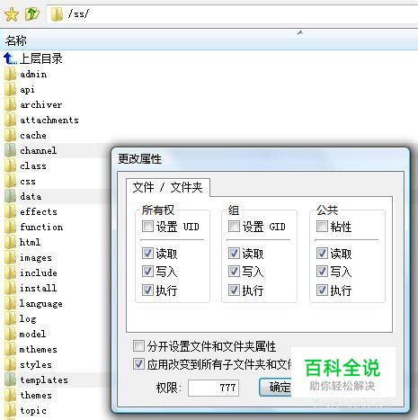 将“权限”项中的数字改为“777”,确定即可(前提是您的帐号有修改文件属性的权限) 注意:如果有些文件需要其子文件也具有777权限,那么还需要选中“应用改变到所有子文件和文件”。
