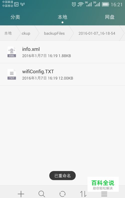 在SD卡里(看之前备份时存的,也可以是内置储存)找到HuaweiBackup文件夹,点进去,再进入backupFiles文件夹,里面就有按时间建立的备份文件夹,按时间选择,我的是16时的,里面就有一个wifiConfig.db。