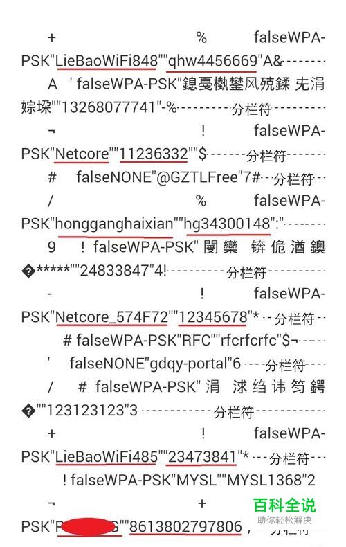 改下文件后缀名为txt,文本查看。先找wifi名字,后面跟着就是密码了。(划线都是,前为wifi名,后为密码) 由于中文识别不了,所以有些中文名的wifi就会出现乱码。