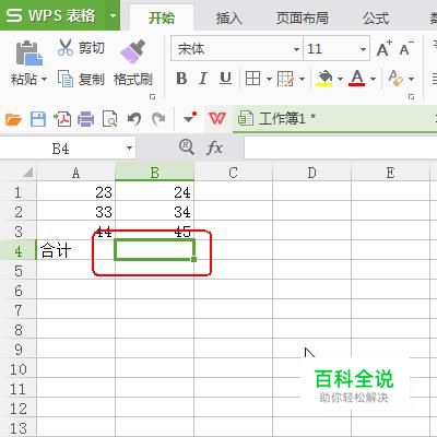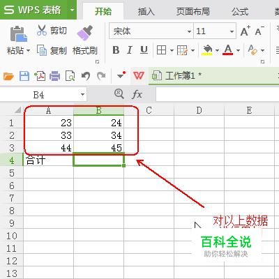 在B4单元格中输入下列数据 =SUM(A1:B3)