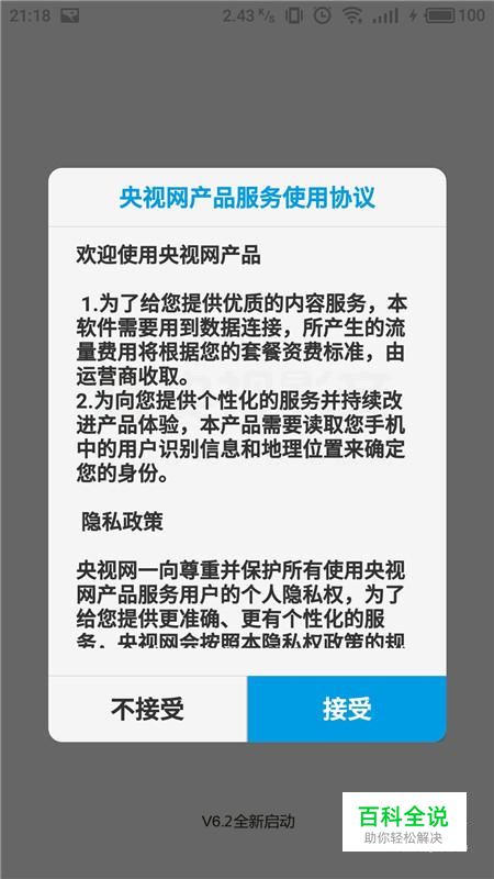 安装完成后,点击进入,在弹框使用协议中,选择“接受”