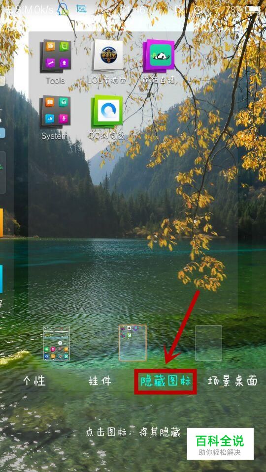 在主界面状态下点击菜单键,在工具栏中找到【隐藏图标】;