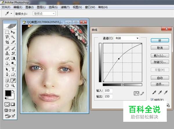 之后我们将曲线向上拖动,和照片的效果做一个对比,脸部磨皮美化即可完成,如图所示。