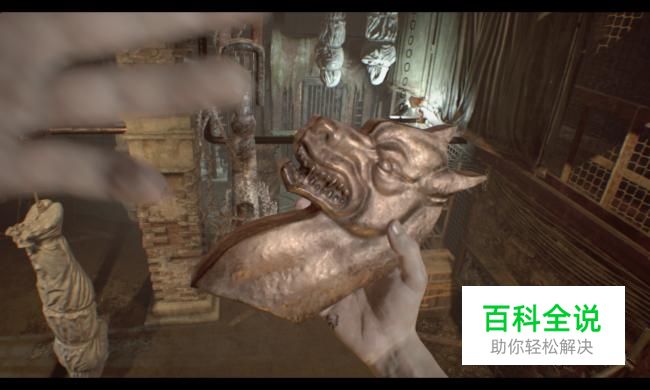 继续前行到太平间,在一个铁构件上找到红色狗头。拿取后出现剧情被老头踢下平台。