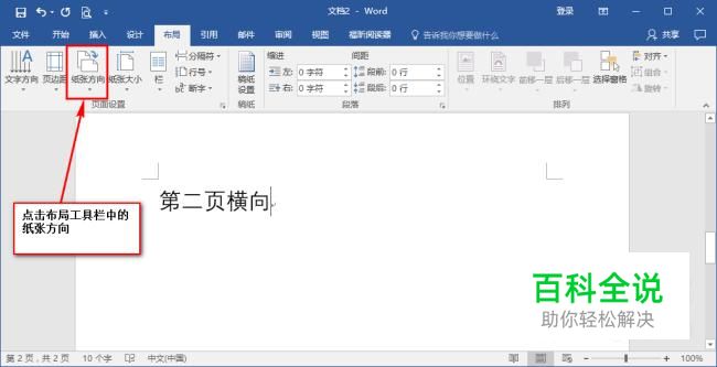 设置好分页符后,将页面定位在第二页,设置纸张方向为横向