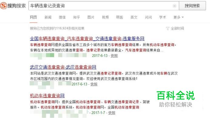 打开搜狗搜索,输入车辆违章记录查询关键字,点击搜索,查看结果。