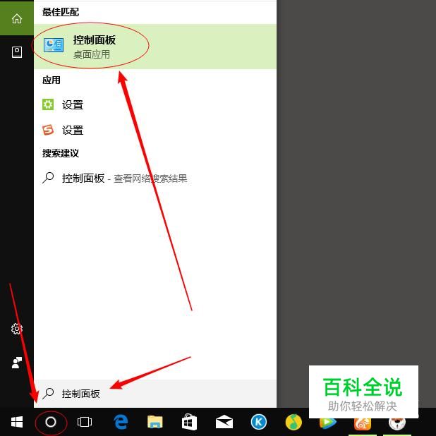 目光移向桌面左下角的小娜,点击小娜搜索图标,在搜索栏中,搜索关键字控制面板,如图所示,点击进入控制面板。