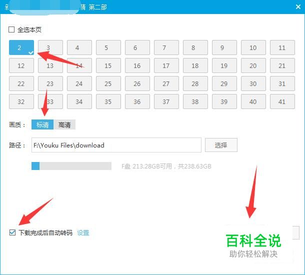 点击勾选第2集,选择标清,勾选下载好自动转码,点击开始下载。
