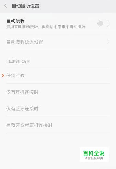 进入自动接听设置界面之后,可以看到自动接听旁边的开关正处于打开状态,现在需要关闭它。