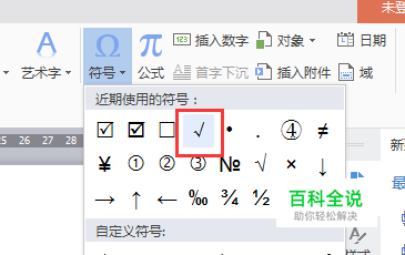 打开Word文档,点击菜单栏的“插入”—“符号”,选择“√”,便在光标处插入符号“√”