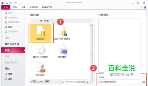 在打开的Microsoft Access 2010软件中选中“空数据库”双击即可创建。或者打击“创建”命令按钮创建,其中文件名处可以选择指定具体的文件名和路径。如下图所示