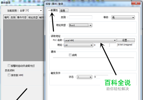 此时页面会切换到事件登录的编辑页面,在事件登录的编辑页面我们点击下方的新增按钮,这时会弹出一个报警登录的设置页面,在此设置页面里我们先把一般属性里的报警触发条件设置好。