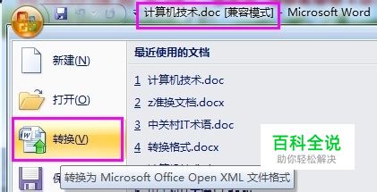 在安装word2007的电脑上打开一个Microsoft Office Word 2003或Word 2002 或 Word 2000 文档 ,然后依次单击【Office按钮】下的【转换】命令,如图