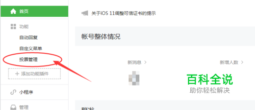 首先,在电脑上进入微信公众平台,登录公众号账户。在公众号首页,点击功能下的【投票管理】,如图所示: