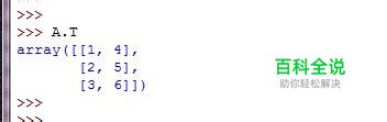 本文用到的所有代码如下: >>> A array([[1, 2, 3], [4, 5, 6]]) >>> >>> >>> >>> >>> >>> >>> A.T array([[1, 4], [2, 5], [3, 6]]) >>> >>> >>> >>> A.T.T array([[1, 2, 3], [4, 5, 6]]) >>> >>> >>> >>> B array([[1, 4], [2, 5], [3, 6]]) >>> D array([[0, 3], [1, 4], [2, 5]]) >>> >>> >>> (B+D).T array([[ 1, 3, 5], [ 7, 9, 11]]) >>> >>> >>> >>> B.T+D.T array([[ 1, 3, 5], [ 7, 9, 11]]) >>> >>> >>> >>> 10*A.T array([[10, 40], [20, 50], [30, 60]]) >>> (10*A).T array([[10, 40], [20, 50], [30, 60]]) >>> >>> >>> >>> >>> np.dot(A,B).T array([[14, 32], [32, 77]]) >>> >>> >>> np.dot(A.T,B.T) array([[17, 22, 27], [22, 29, 36], [27, 36, 45]]) >>> >>> >>> >>> np.dot(B.T,A.T) array([[14, 32], [32, 77]]) >>> >>> >>>