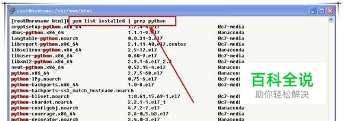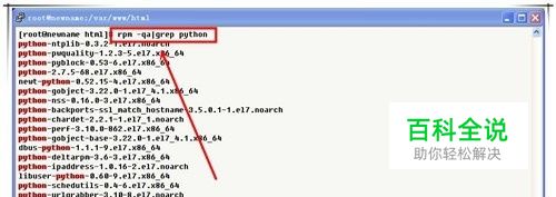 验证是否安装 首先,我们来查看一下Python 有没有已经安装好了,运行“yum list installed | grep python”或“rqm -qa|grep python”命令。如果可以查询到结果,则表明已经安装好,否则表示尚未安装。或直接运行“python”命令,没报错则已经安装。