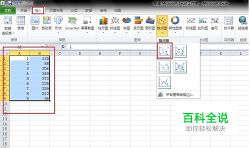 本经验以添加X=1.5,Y=150着两条直线作为分界线为例(如果只需要加一条线,将相应的),详细的说明如何用误差线来快速添加这两条分界线,首先打开Excel文件,将所要处理的数据添加散点图,步骤为:选中数据——插入——散点图