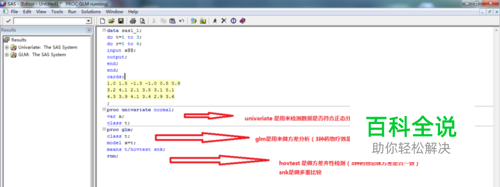 打开SAS,输入代码。 代码功能分别是: 1.检测数据是否符合正态分布 2.总体数据方差齐性检测 3.方差分析,3种药物疗效间是存在差异(只要不是安慰剂组方差=盐酸二甲双胍组方差=新药组方差,3种药物疗效即认为是存在差异)。 4.多重比较(第三步骤确定3种药物存在差异,到底是3者方差都不相同,还是其中两种相同,两外一种不同,使用多重比较可以判断出来)。