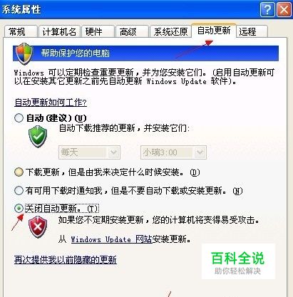 切换到“自动更新”选项卡,选择“关闭自动更新”,单击“确定”