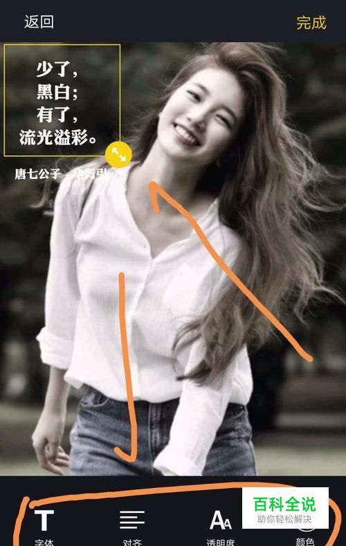 如果要对文字字体、对齐、透明度、颜色修改,可点按下方对应功能键金星修改,文字的位置可通过拖动文字实现,文字大小可通过拖动文字框右下角调整,最后点按完成。