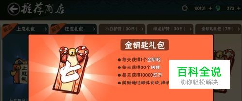 第二,金钥匙礼包,金钥匙礼包中每天可以获得1把金钥匙、30个铁锤、10000忍币,连续发放7天,价值68元。