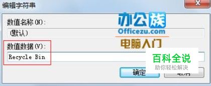 在新建的注册表项的右侧窗口,双击默认,把数值数据改为Recycle Bin即可。