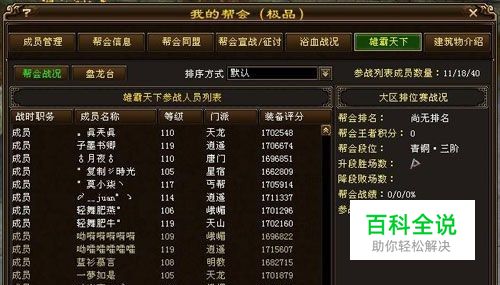 TIP1战团组织 雄霸天下的参加不像八皇,不是每个帮会成员都能直接参战。帮主需要在晚上7.50前将作战人员添加进参战列表,记住可以添加40名成员,但是上场的只能有30名。谨记只能是参战列表中的成员加入团队才能顺利的传送进战备室,各位没有被添加进参战列表的成员可以查看帮派事物方面雄霸天下专区有参战人员详情。此处为重点,人员的组织必须在7.50前完成,7.50后将不支持参战人员的调整(意思是不可以有新的帮众加入战团,也不能移除已有参战列表成员)。