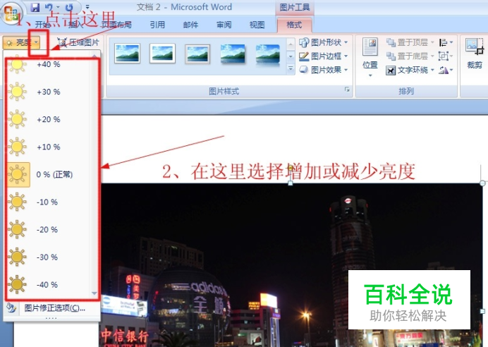 双击这张图片,在word上面菜单栏会新增一个“格式”选项卡,点击“亮度”后面的小三角形。在下拉菜单中选择合适的亮度值即可。这里选择亮度+20%.