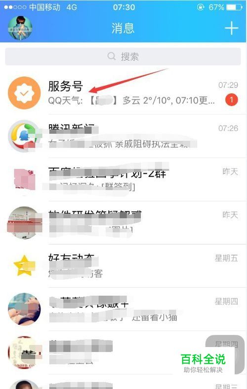 有时我们在使用qq的时候,qq会推送一些服务号消息,让我们总是以为有好友消息,但是打开qq之后,却发现列表中的是服务号qq天气的推送消息,如图所示。