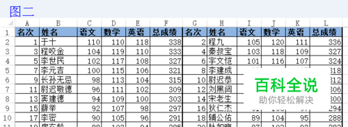 情景:如下图所示,有成绩表一份,并已经按照总成绩的高低进行了排名,现在想在同一张纸上打印出来,且要美观。而行数太多,无法一页打印,所以我们将表格调整为两栏,并要求名次从左到右、从上到下依次递增。即由图一所示调节成图二所示。