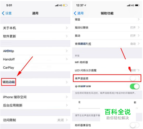 手机主菜单,点击“设置”-“通用”-“辅助功能”-“单声道音频”-“关闭”